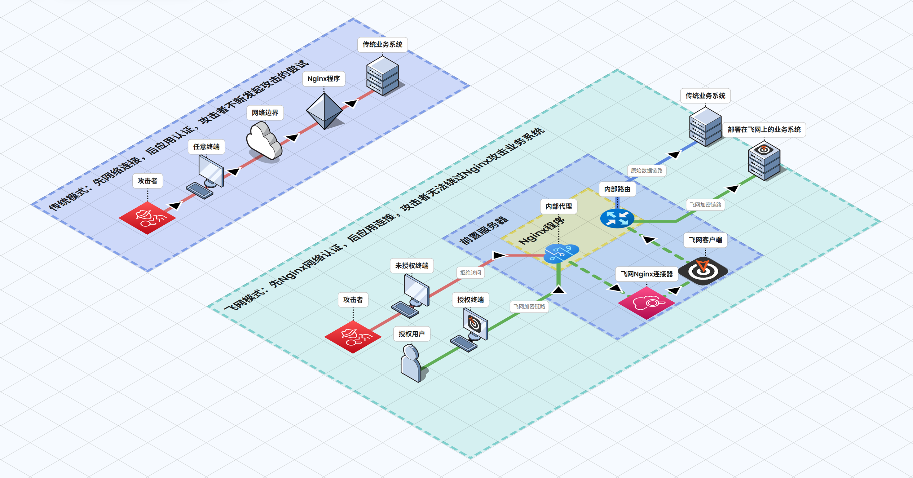 传统接入 vs 飞网接入 架构对比图